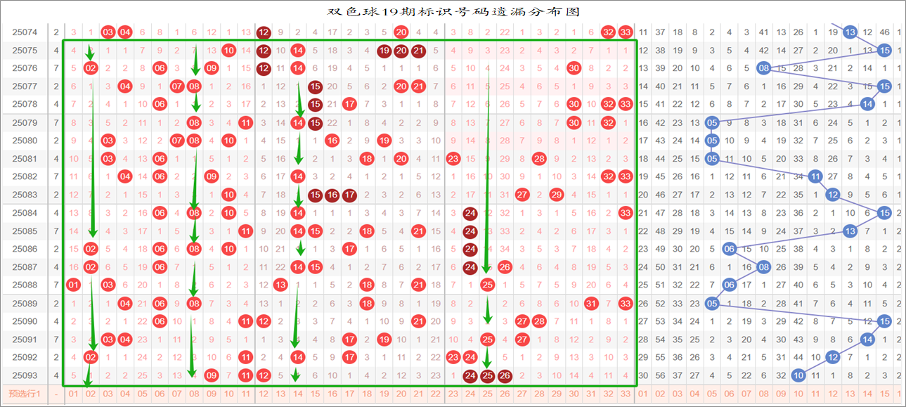 双色球第2025094期组号,去除上期统计排序同位置号码得出:
