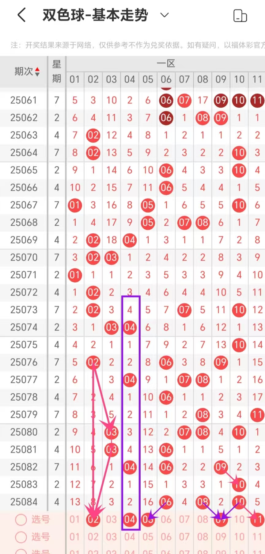 通过对同星期周日重号出现数量规律进行统计分析,本期考虑出号0-1个,即04-06-09-14-32-33出号0-1个