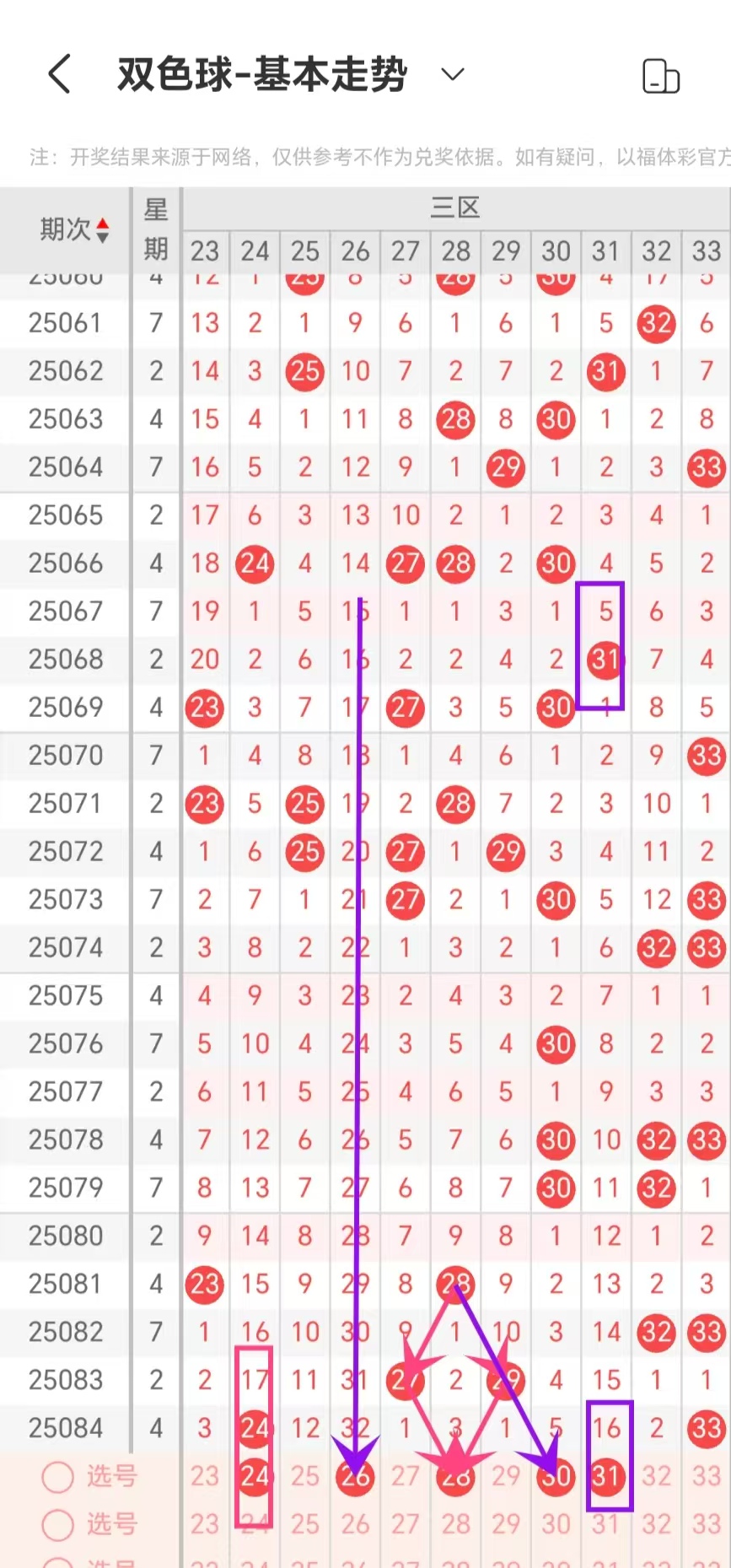 通过对同日期重号出现的数量规律进行统计分析,本期考虑出号0-1个,即08-09-10-22-26-32出号0-1个