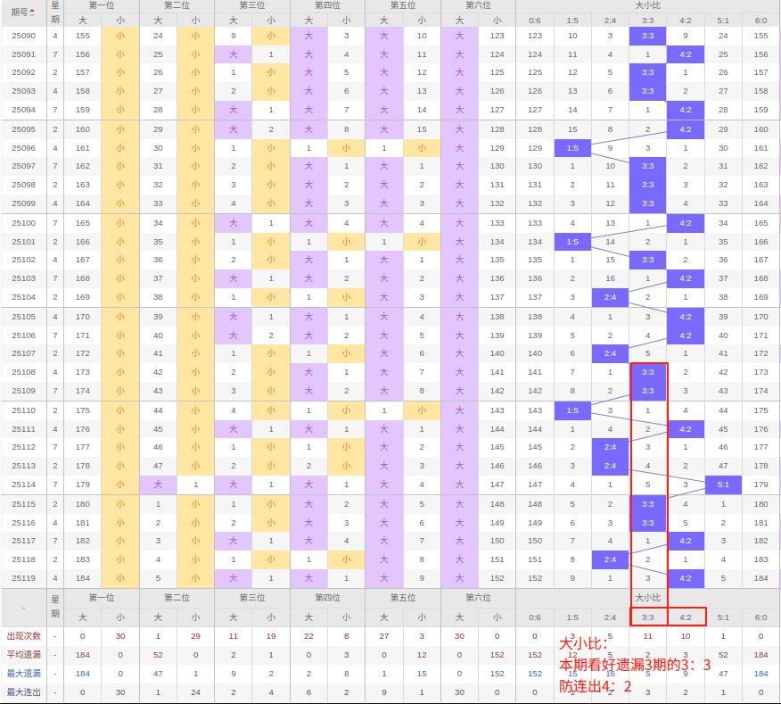上期大小比:4:2,近10期大小比出现情况:3:3、1:5、4:2、2:4、2:4、5:1、3:3、3:3、4:2、2:4、4:2,最近10期出现2期3:3,出现3期4:2,出3期2:4,出现1期5:1,出现1期1:5,出现0期6:0,出现0期0:6,根据近10期规律本期看好遗漏3期的3:3,防连出的4:2,综上所述推荐大小比推荐:4:2,重点关注:3:3。