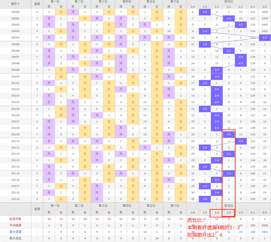 上期质合比:1:5,近10期质合比出现情况:4:2、1:5、3:3、2:4、1:5、3:3、2:4、1:5、2:4、1:5,最近10期出2期3:3,出现1期4:2,出现3期2:4,出现0期5:1,出现4期1:5,出现0期6:0,出现0期0:6,根据近10期规律本期看好遗漏4期出3:3,防隔期开出2:4,综上所述推荐质合比推荐:2:4,重点关注:3:3。
