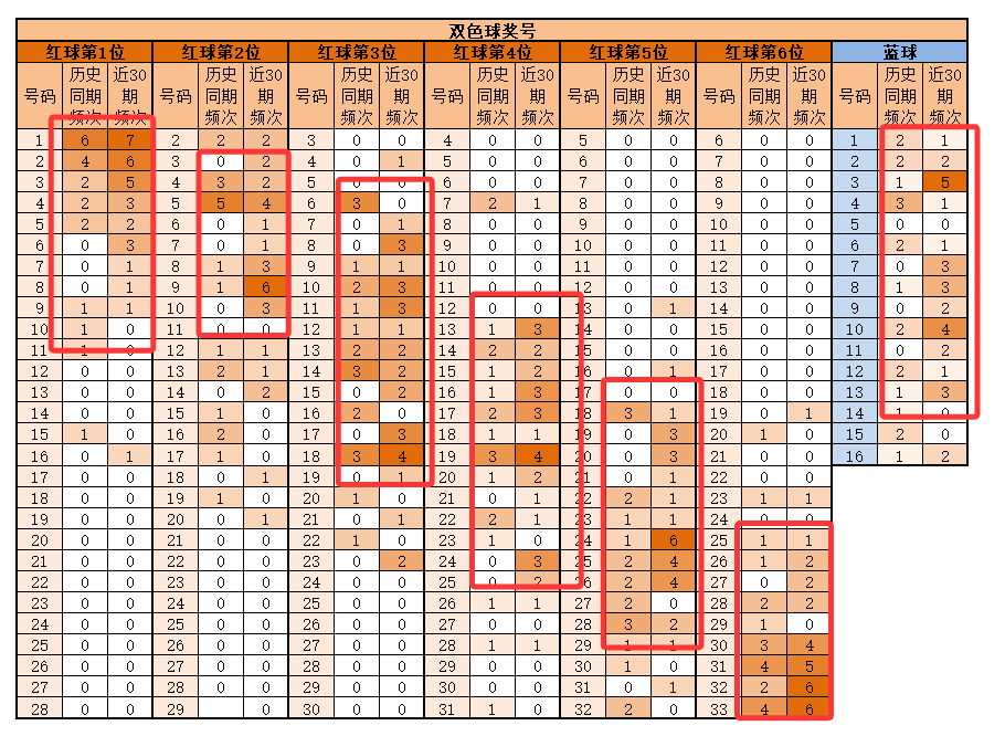 6位,基本在24-33之间,历史同期频次最多的31-3230期,频次最多的为32-33,明显特征是合数优势;推荐重27-28-30-31-32-33