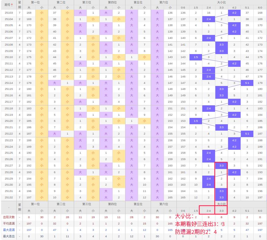 上期大小比:3:3,近10期大小比出现情况:4:2、4:2、2:4、2:4、3:3、4:2、2:4、2:4、3:3、3:3,最近10期出现3期3:3,出现3期4:2,出4期2:4,出现0期5:1,出现0期1:5,出现0期6:0,出现0期0:6,根据近10期规律本期看好三连出3:3,防遗漏2期出2:4,综上所述推荐大小比推荐:2:4,重点关注:3:3。
