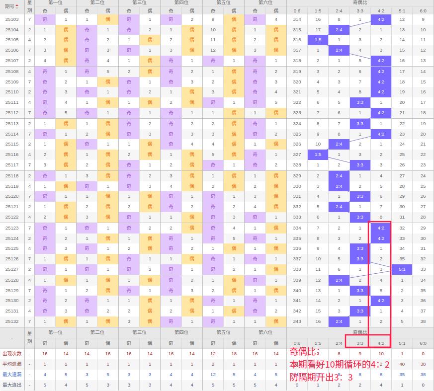 上期奇偶比:3:3,近10期奇偶比出现情况:4:2、4:2、3:3、3:3、3:3、2:4、3:3、4:2、3:3、2:4,最近10期出现5期3:3,出现3期4:2,出现2期2:4,出现0期5:1,出现0期1:5,出现0期6:0,出现0期0:6,根据近10期规律本期看好10期循环的4:2,防隔期开出3:3,综上所述推荐奇偶比推荐:3:3,重点关注:4:2。