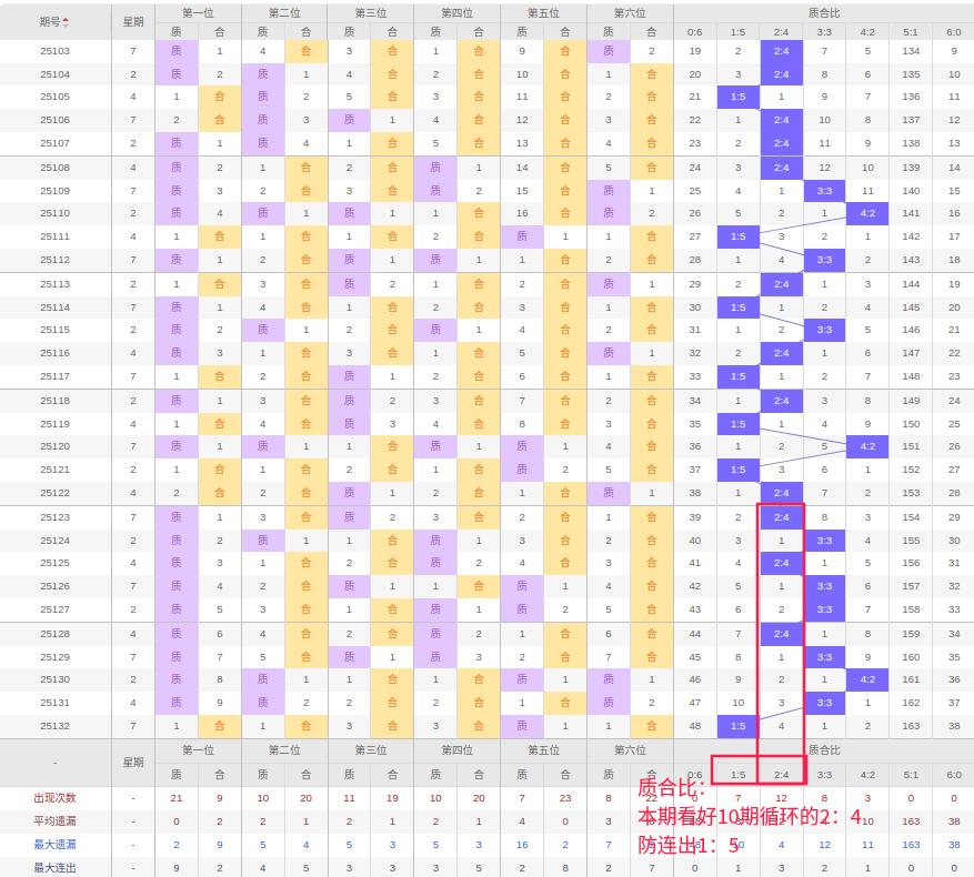上期质合比:1:5,近10期质合比出现情况:2:4、3:3、2:4、3:3、3:3、2:4、3:3、4:2、3:3、1:5,最近10期出5期3:3,出现1期4:2,出现3期2:4,出现0期5:1,出现1期1:5,出现0期6:0,出现0期0:6,根据近10期规律本期看好10期循环的2:4,防连出1:5,综上所述推荐质合比推荐:1:5,重点关注:2:4。