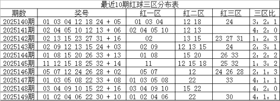 一区上期走热,开出4个红球,近10期开出27个红球,表现非常活跃,本期预计走温,开出1-2个红球,参考号码01;二区上期走温,开出1个红球,近10期共开出19个红球,出号比例与理论持平,本期看好走热,开出3个红球,注意号码12、16、17;三区上期走温,开出1个红球,近10期共开出14个红球,走势相对较冷,本期预计继续温冷,看好号码25、33;