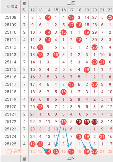 根据走势图可以看出当前区段,116期没有开出号码球,117期开出了17.20二个号码球,118期开出了16一个号码球,119期没有开出个号码球 ,120期开出13一个号码球 ,121期没有开出号码球 ,122期开出个16.18.19.20四个号码球 ,123期没有开出号码球 ,124期开出个18.19.21三号码球 ,125期开出12.13二个号码球 ,按照如此规律本期当前区可能开出2单或1单。我们看下当前区上期没有开出重叠号,那么本期当前区要定重叠号的情况下可关注13号码球。再看下当前区上期没有开出斜连号,当期选号得留意斜连14号码球。本区重点关注14.15.17.19.20