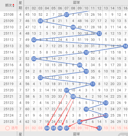 根据走势图近10期的走势看,蓝球在107期开出13蓝球之后,3小1大1小2大1小2大1小1大2小4大,再看下近10期的蓝球热码有回补的趋势,这种趋势规律本期判断极有可能开出双号,本期防蓝球16大号,蓝球本期重点关注04,05,06,07,12