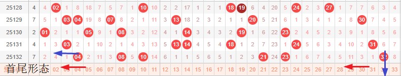 如图所示:首尾制约平衡组范围依次为:推推推,推推? 本期形态范围优先选择红色左推首尾。由于上期号码已经进入新走势第4期,目前处在新走势第5期,利用常规起号形成左推还是拉伸就是走势正反方向。