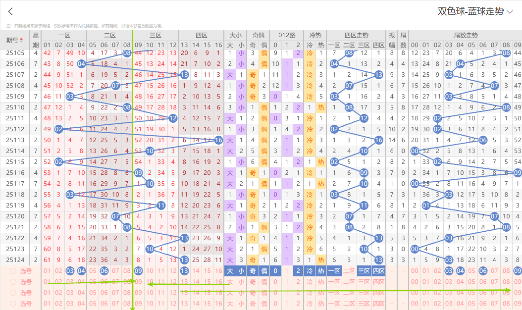 上期开出大号奇数13,从走势上号码整体分布结合折线运行轨迹本期蓝球重点关注五码03 04 06 09 13参考。有关更多详细选号思路以及号码组合搭配 我们15:00~17:30点有选号思路详细解析的直播节目欢迎大家前来一起探讨交流。