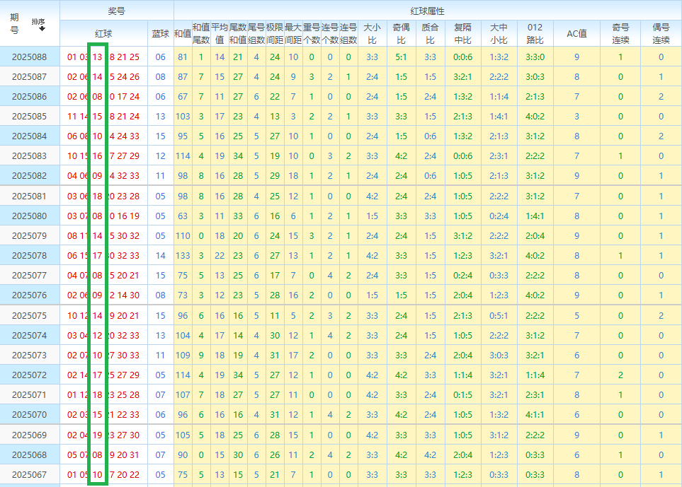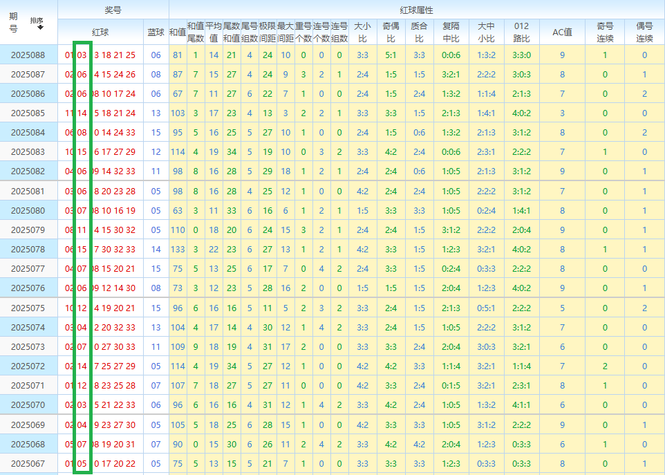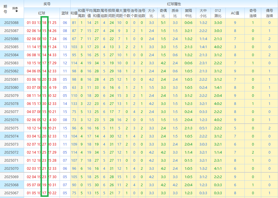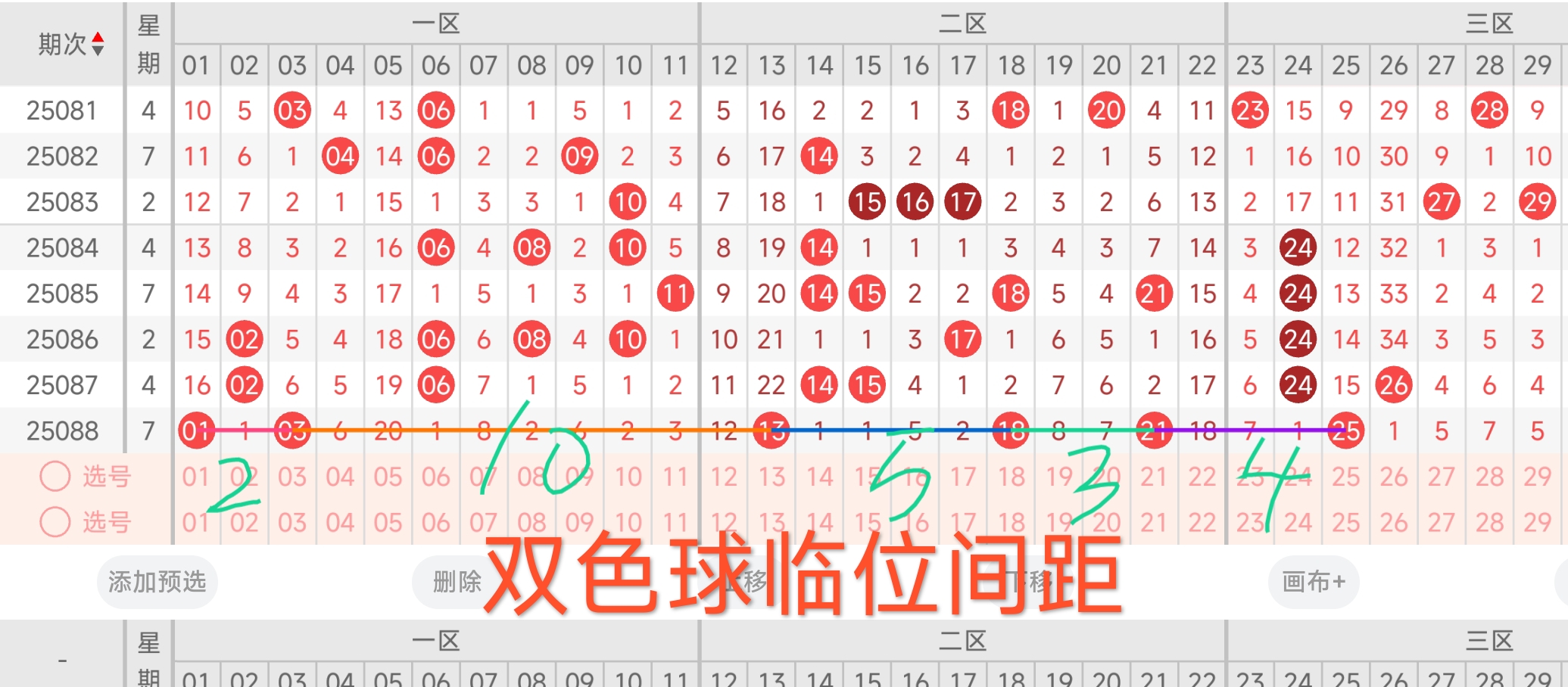 临位间距分析解释:红球开奖号码从小到大排列共有6个数,他们之间相互的距离,如上期开奖03 07 08 10 16 19,那么第一位和第二位的球间距就是4.