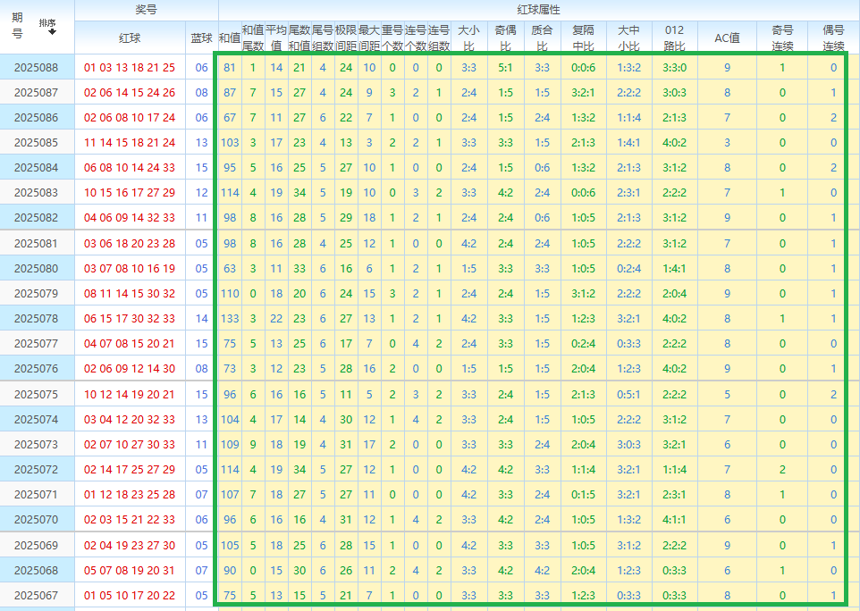二、看平均值、尾号组数、极限间距、最大间距、重号个数、连号组数,大小比、奇偶比、012路比、复隔中比