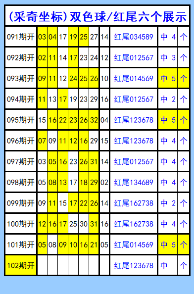 双色球第102期图文(采奇坐标),红尾六个展示