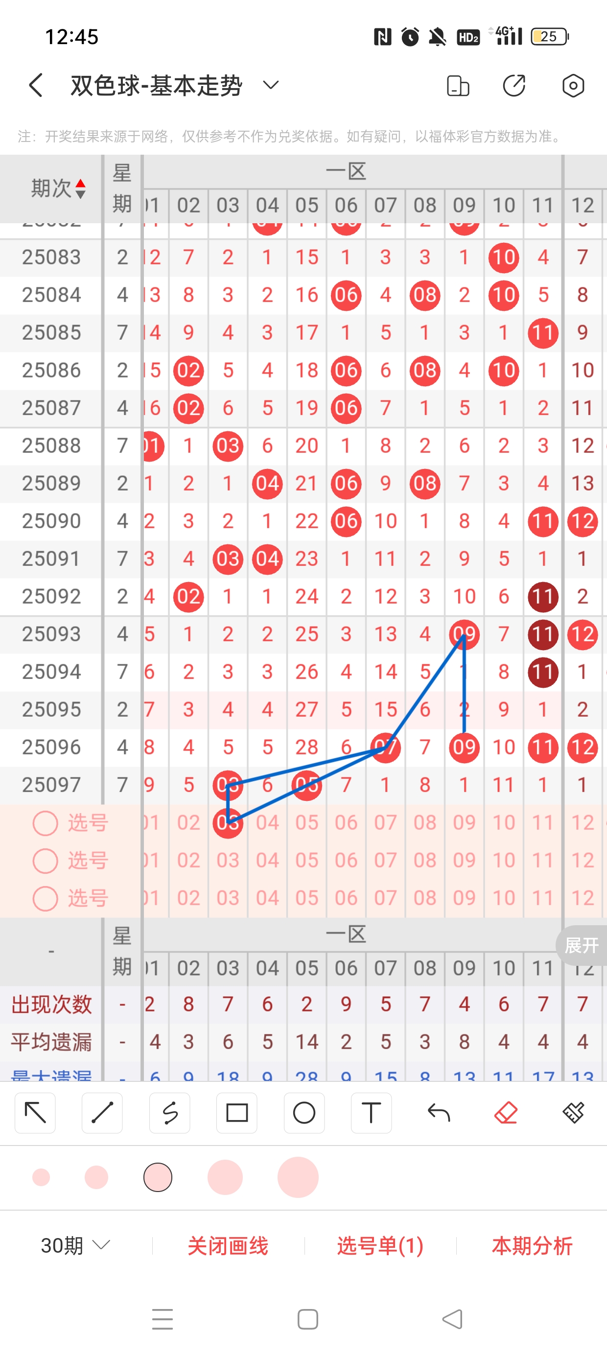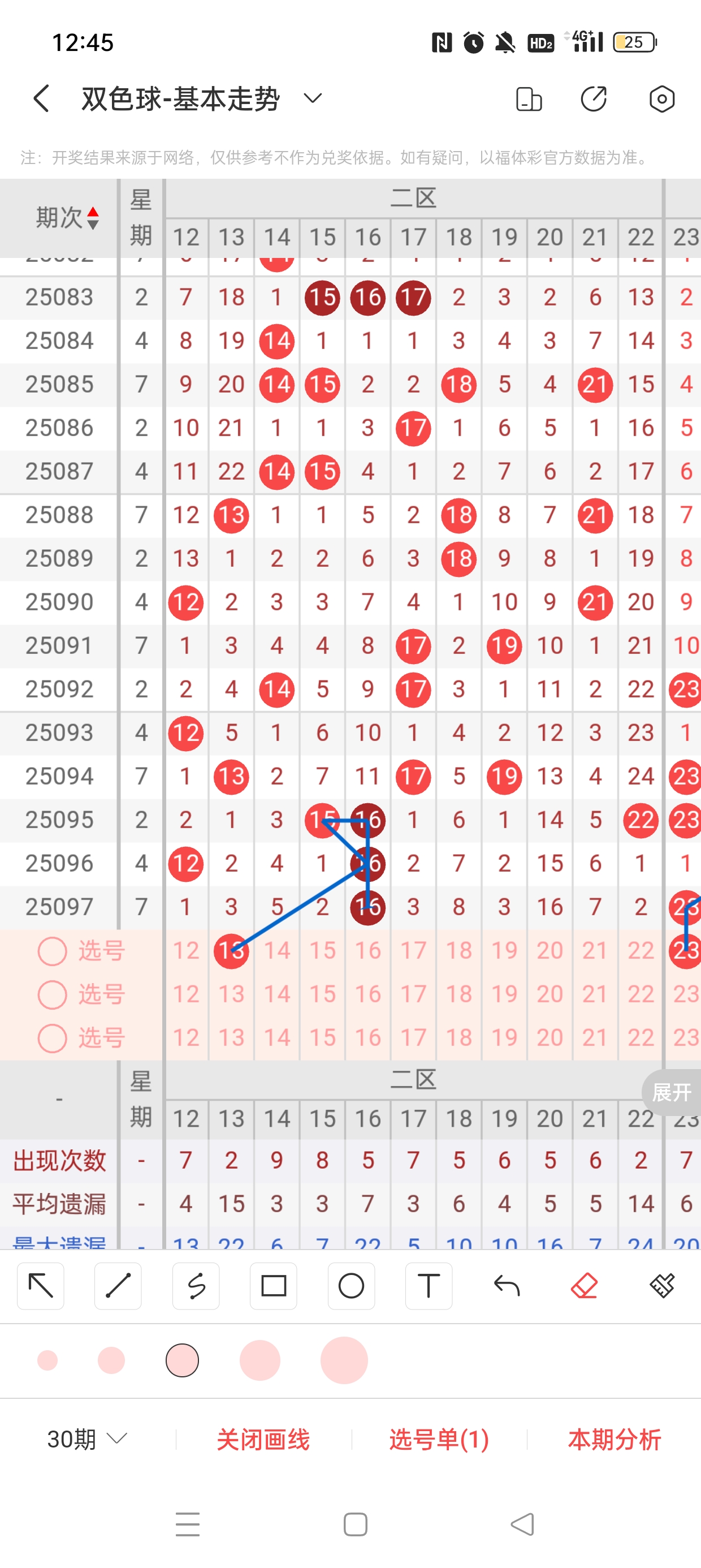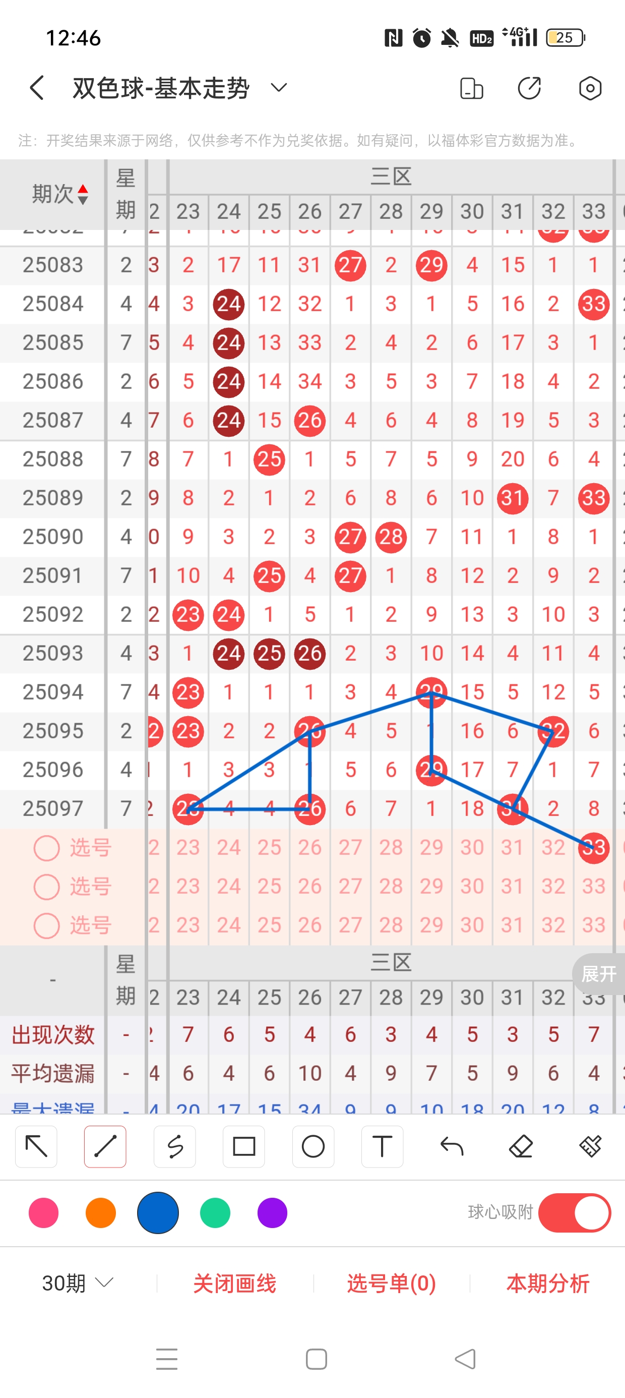 25098期双色球,上期5+0,本期目标6+1