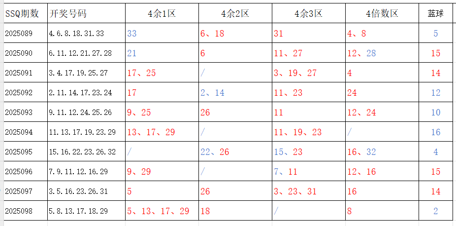 分享第一个数据分析:四分区统计数据。相对于传统的三分区,个人习惯使用四分区,就是把33个红球号码除以4,所得的余数分区如下: