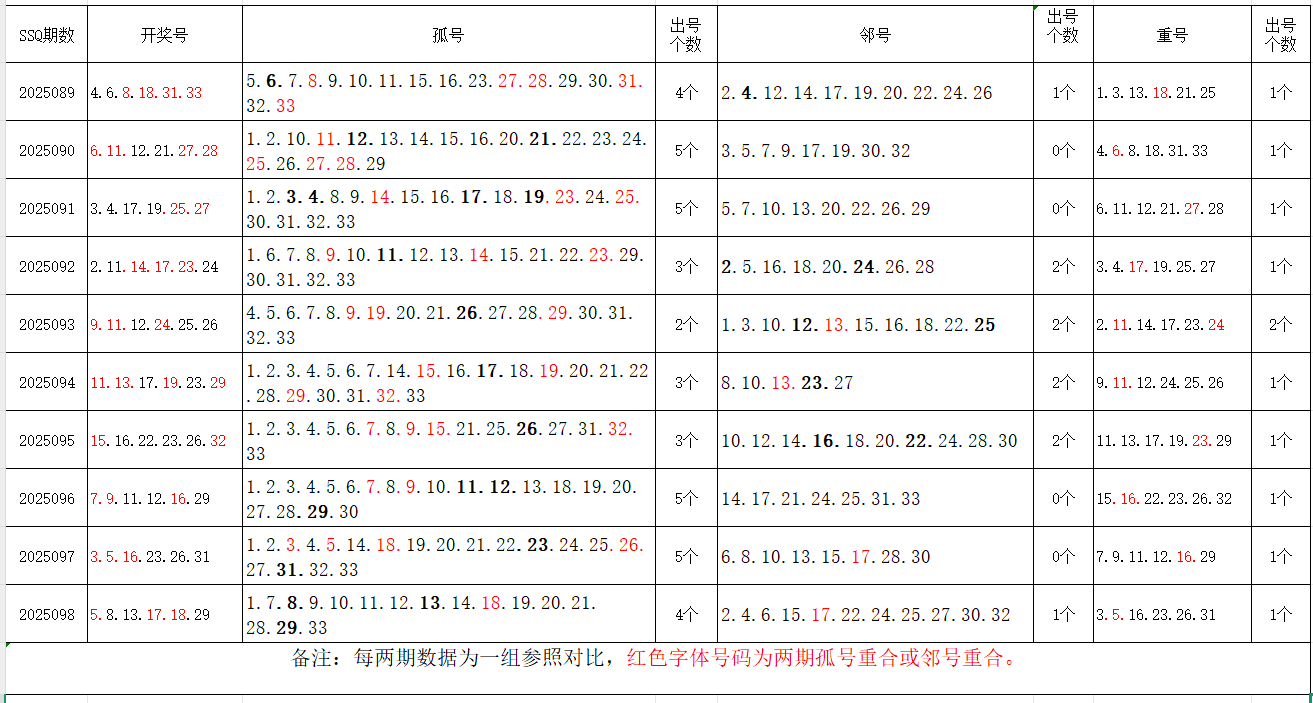 如图,以近两期数据为一组,进行对比分析。相同的孤号、邻号,可能在下期出1-4个左右。上期孤号开出4个,邻号开出1个,重号1个。本期参考孤号:1.2.3.10.11.15.20.21.22.23.24.25.26.27.31.32.33;邻号:4.6.7.9.12.14.16.19.28.30。孤、邻号重合号码精选:***(会员专区可见)。个人分析,仅供参考。