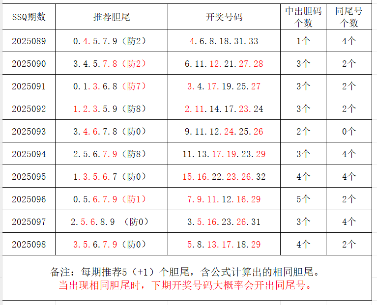 如图,每期推荐胆尾中出1-4个。上期推荐胆尾中出4尾4码!推荐胆尾是按照公式计算的顺序,不定位红球号码的顺序。本期推荐胆尾:7尾/1尾/2尾/6尾/3尾  。加推重点胆尾:***(会员专区可见)。推荐胆码号码:***(会员专区可见)。个人分析,仅供参考。