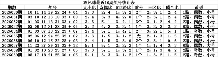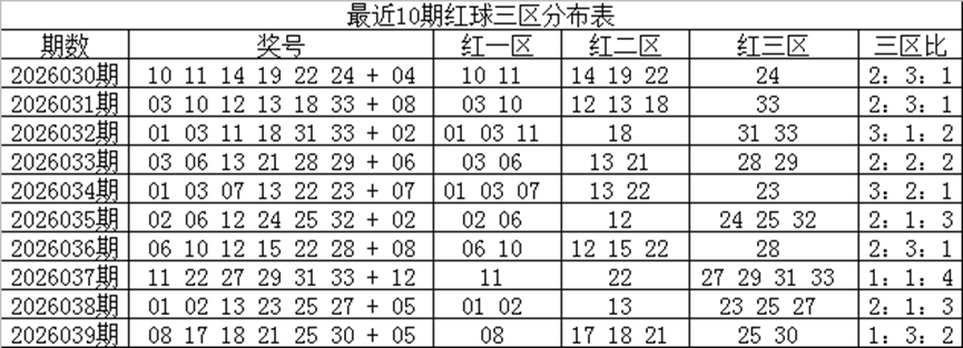一区上期走温,出现1个奖号,近10期开出20个红球,走势与理论相当,本期预计再次走温,出现1-2个奖号,参考号码04、10;二区上期表现较热,出现3个奖号,近10期共开出20个红球,出号比例与理论持平,本期预计继续走温,出现1-2个红球,注意号码15、19;三区上期走温,开出2个红球,近10期共开出20个红球,出号与理论个数持平,本期预计继续走温,出现1-2个红球,看好号码26、32;