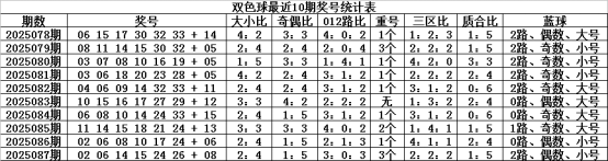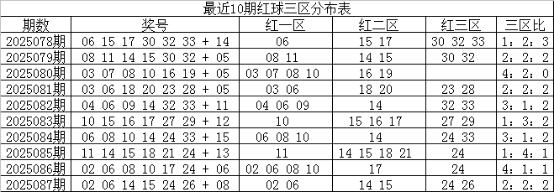 一区上期走温,出现2个奖号,近10期开出23个红球,表现非常活跃,本期预计走温,开出1-2个红球,参考号码05、10;二区上期走温,开出2个红球,近10期共开出20个红球,出号比例与理论持平,本期预计继续走温,出现1-2个红球,注意号码14、22;三区上期走温,开出2个红球,近10期共开出17个红球,走势相对较冷,本期预计继续温冷,看好号码28、32;