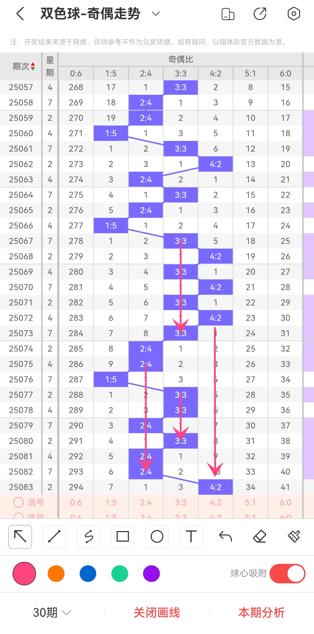 上期奇偶比为4:2,分别为偶奇偶奇奇奇。往前一期奇偶比为2:4。4:2奇偶比终于在遗漏了10期以后回归了。由奇偶走势图和历史数据分析,本期是有可能继续出4:2奇偶比的,但比较大的概率是会出3:3奇偶比或者2:4奇偶比。