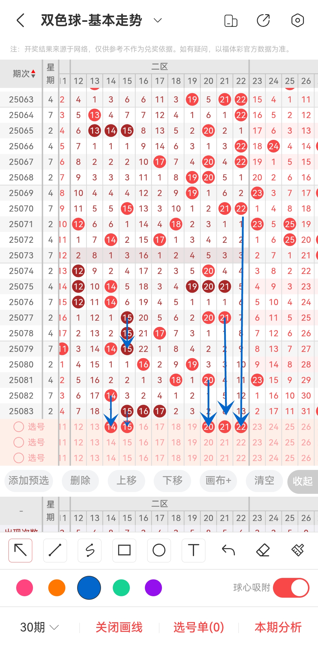 上一期二区开出为15,16,17。往前一期开出了14。上期二区开出了3个数字,往前一期只开出了一个数字。所以上期是回补了。上期开出的15属于热号,要考虑连出的可能性。纵观近30期,二区也是开出数字比较多的区间,也有不少热门的号码。那么我们可以关注一下近期没有开出的热门号码,例如20,21,22有可能回归。除此之外14号,通过走势图可以看到几乎每隔一两期就会开出,因此本期也要注意一下。所以推测本期可能开14,15,20,21,22等号。