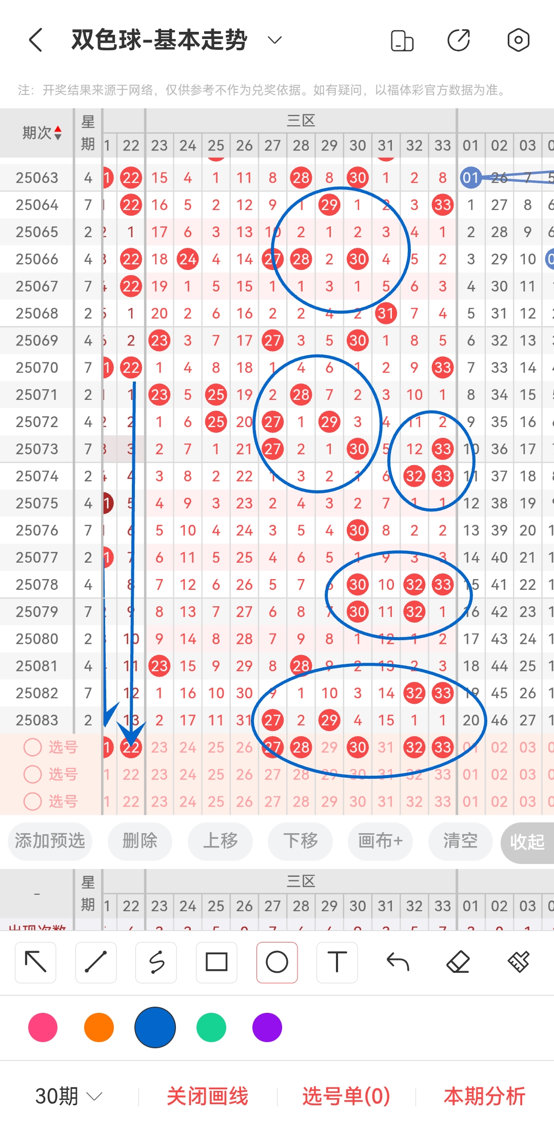 上一期三区开出27和29。往前一期开出的是32和33。通过分析三区走势图,我们可以发现三区开出的数字比较少,且集中在某几个数字。那么本期我们依旧从这些数字中选择。27,是比较热门的,可以考虑连出。同时比较热门的还有28,30,32和33。所以本期我们推测有可能开出27,28,30,32,33等号码。