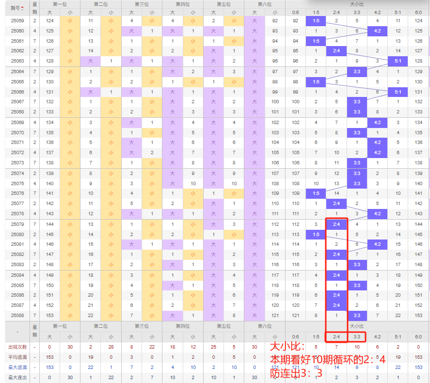 上期大小比:3:3,近10期大小比出现情况:2:4、1:5、4:2、2:4、3:3、2:4、3:3、2:4、2:4、3:3,最近10期出现2期3:3,出现2期4:2,出5期2:4,出现0期5:1,出现1期1:5,出现0期6:0,出现0期0:6,根据近10期规律本期看好10期循环的2:4,防连出3:3,综上所述推荐大小比推荐:3:3,重点关注:2:4。