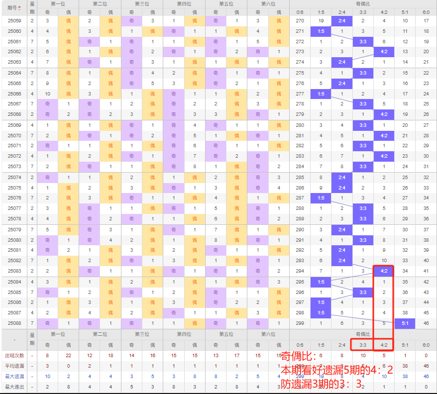 上期奇偶比:5:1,近10期奇偶比出现情况:2:4、3:3、2:4、2:4、4:2、1:5、3:3、1:5、1:5、5:1,最近10期出现3期3:3,出现1期4:2,出现3期2:4,出现1期5:1,出现3期1:5,出现0期6:0,出现0期0:6,根据近10期规律本期看好遗漏5期的4:2,防遗漏3期的3:3,综上所述推荐奇偶比推荐:3:3,重点关注:4:2。