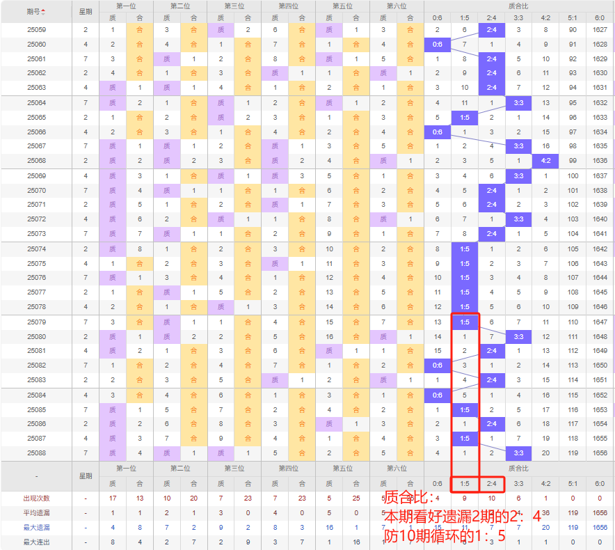 上期质合比:3:3,近10期质合比出现情况:1:5、3:3、2:4、0:6、2:4、0:6、1:5、2:4、1:5、3:3,最近10期出2期3:3,出现0期4:2,出现3期2:4,出现0期5:1,出现3期1:5,出现0期6:0,出现2期0:6,根据近10期规律本期看好遗漏2期的2:4,防10期循环的1:5,综上所述推荐质合比推荐:1:5,重点关注:2:4。