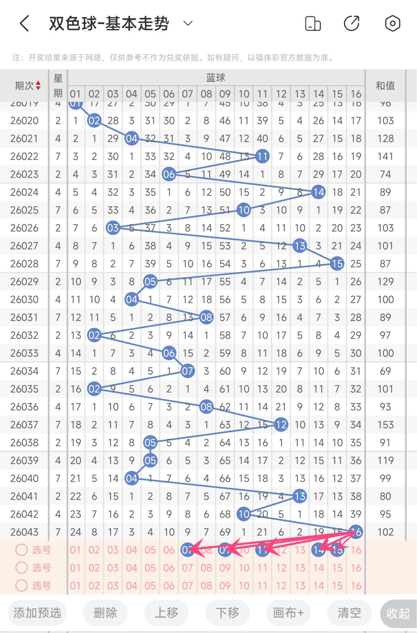 上期开出的是16,往前一期开出的是10。趋势往右移动,偏移量为6。通过分析目前蓝球的走势图,目前趋势是大概率往左。从偏移量看,本期偏移量有可能变小一点,也有可能变大一点,再结合冷热号,上期冷号16回补,本期冷号9防备一下。最后再结合遗漏期数,以及冷热号,本期我们可以关注79111415等号码。