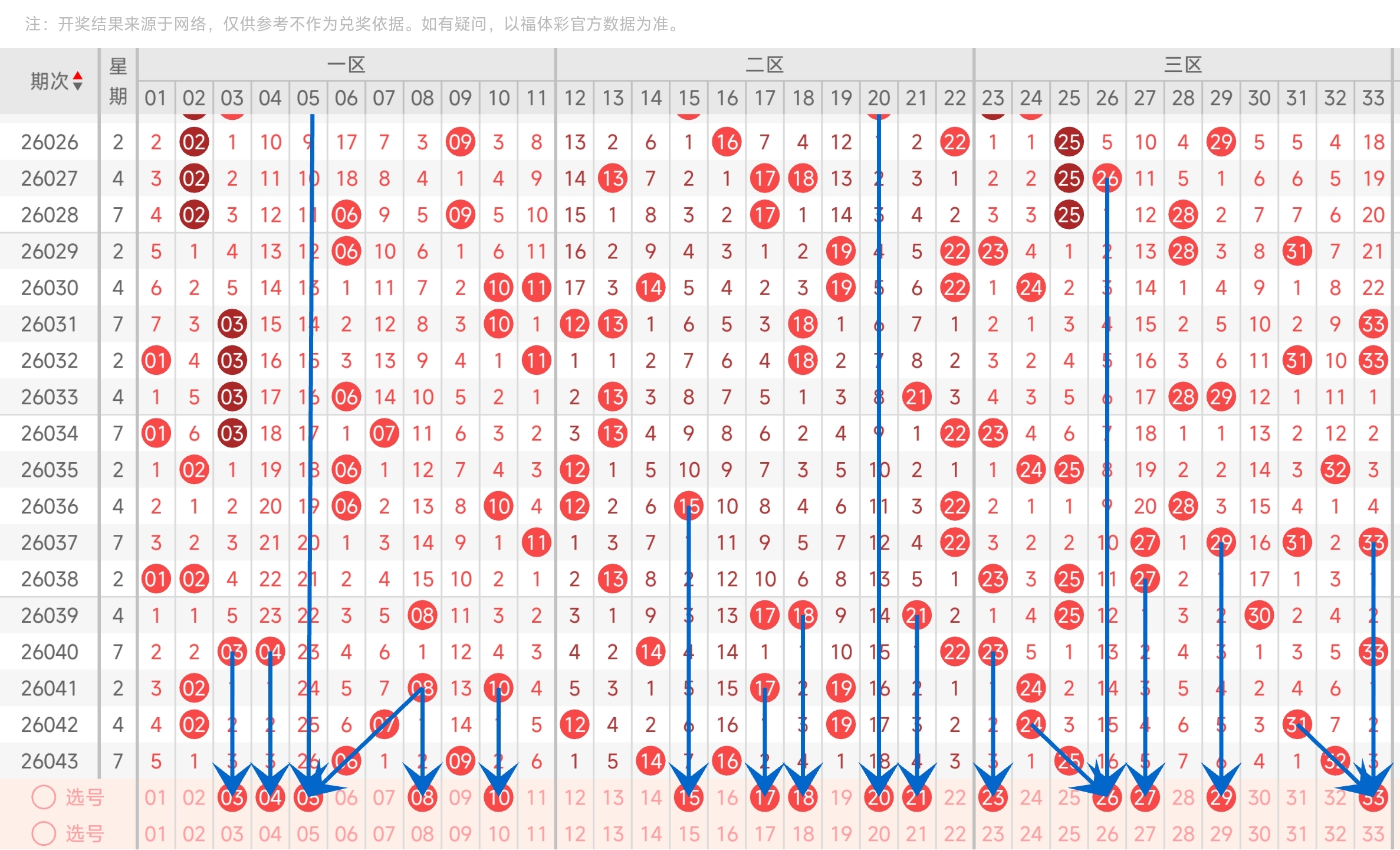 上一期三区开出了2532号球。往前一期开出了2431号球。通过走势图分析,可以看到上期三区开了2码,本期关注2码。上期开的两码都是邻码,本期2632也关注一下,然后还有比较看好的有2729,可能回补。最后再结合冷热号和遗漏期数,本期我们可以关注2326272933等号。