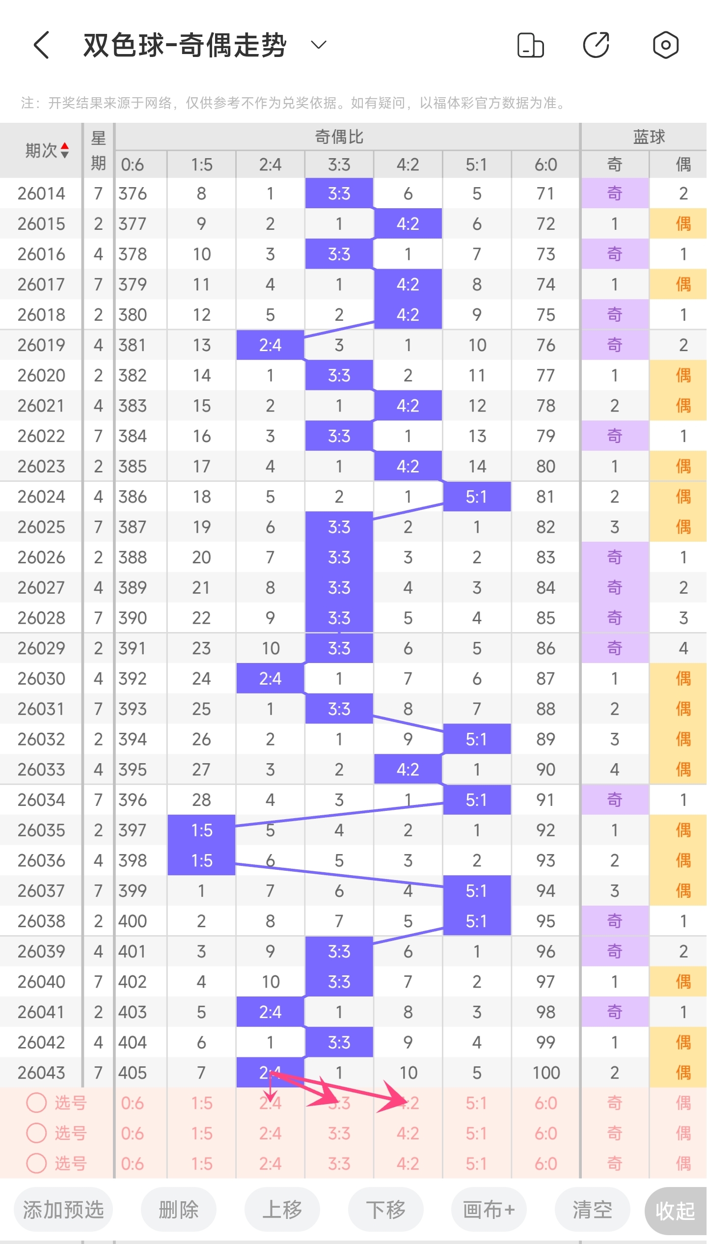 上期奇偶比为2:4,分别为偶奇偶偶奇偶。往前一期奇偶比为3:3。通过近30期内奇偶走势的数据分析,目前1:5奇偶比开出的概率是6.66%5:1奇偶比开出的概率是16.66%3:3奇偶比开出的概率是43.33%4:2奇偶比开出的概率是23.33%2:4奇偶比开出的概率是13.33%6:0奇偶比开出的概率是0%。与前一期相比,概率没有变化。通过分析走势图,上期开了3:3奇偶比,本期有可能开4:2或者3:3奇偶比,其次是2:4奇偶比。所以本期推测本期可能开4:2奇偶比和3:3奇偶比,其次是2:4,最后是1:55:1奇偶比。