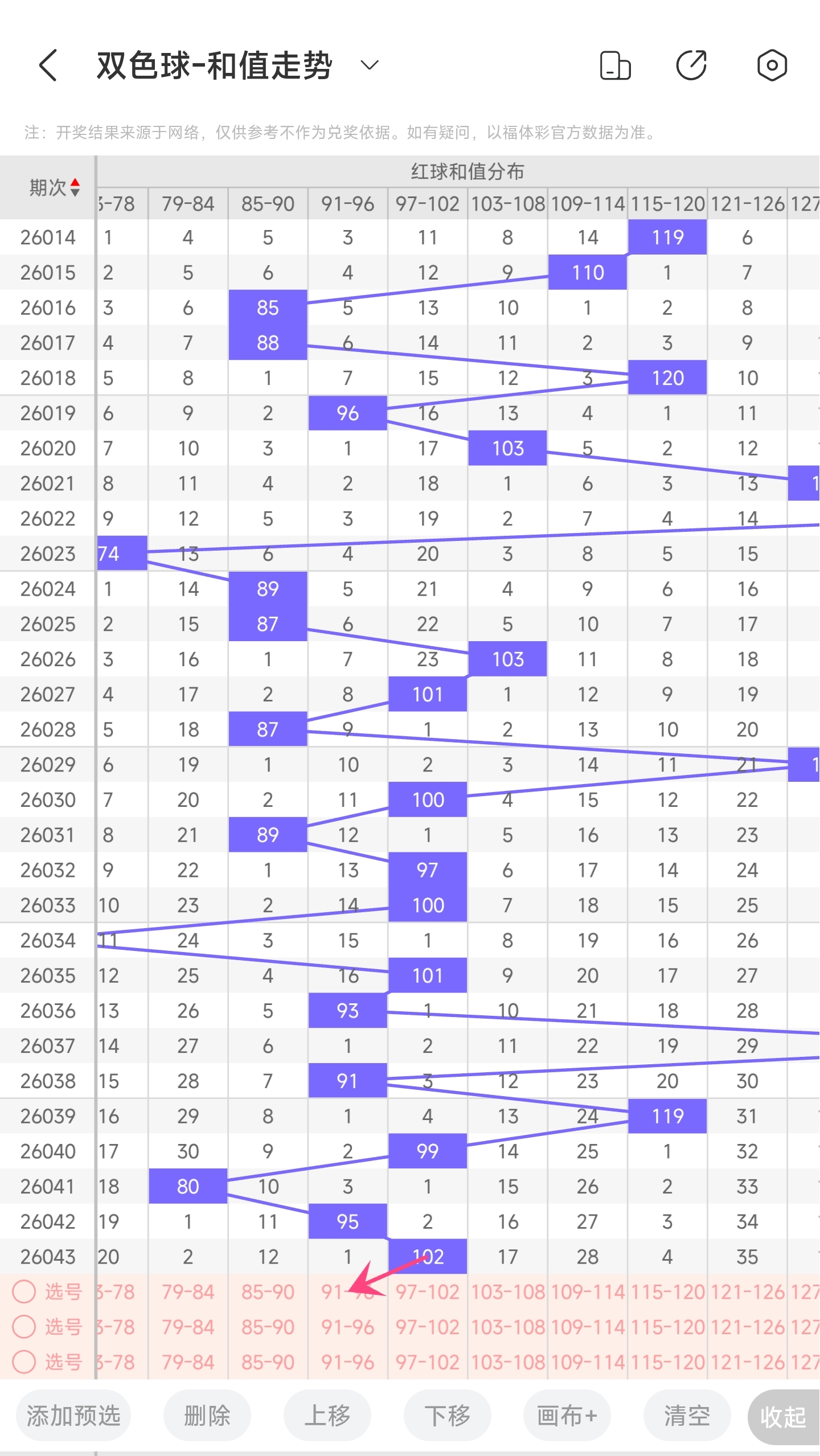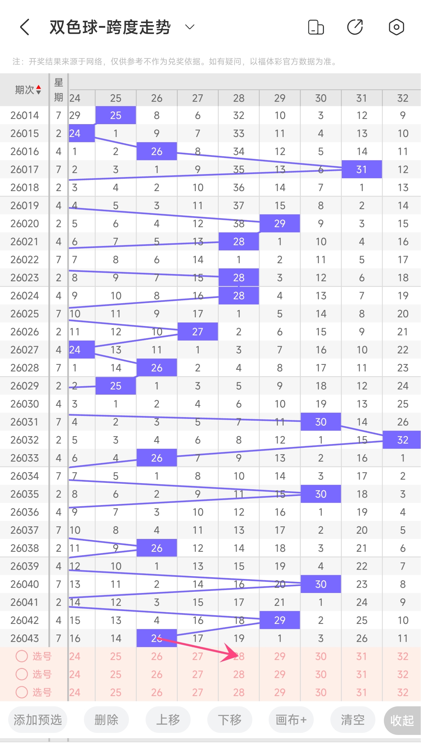 上期龙头为6,凤尾为32,跨度为26,往前一期跨度是29,偏移量为326跨度值是30期内开出比较大的跨度值。上升的空间比较小,下降空间比较大,但根据最近龙头凤尾走势,本期跨度可能会变大一点,所以推测本期跨度趋势是往右的,跨度变大,小概率跨度变小。