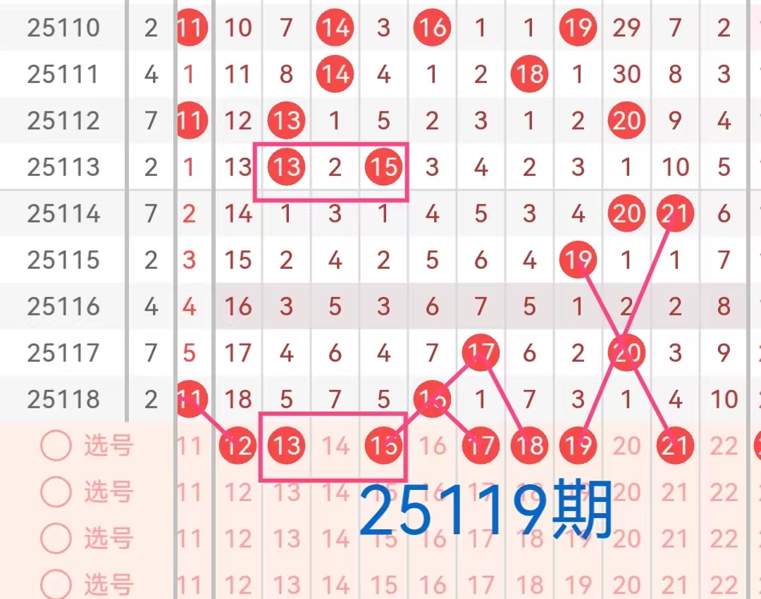 2. 第二区间(12-22):此区间在上期开出一个号码16,号码16遗漏7期后开出,且与前期开出的号码17形成斜连走势。从历史数据来看,该区间内的号码近期出现频率较低,预计本区间会有号码继续开出,博士认为该区可能出1-2个号码。号码12、17、21近期遗漏次数较大,本期有望回补开出。号码13、15、17、19近期表现较好,本期有望开出。因此本期可关注号码12、13、15、17、18、19、21