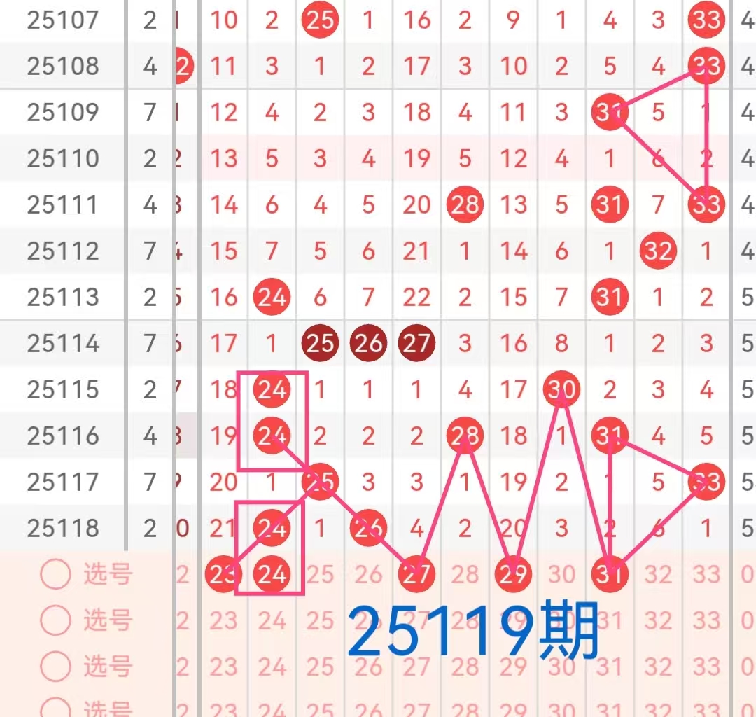 3. 第三区间(23-33):此区间在上期开出两个号码24和26。号码24在遗漏1期后开出,且与前期开出的号码25形成斜连走势。号码26是个重点偏大的凤尾号,在遗漏3期后再次开出,本期预计凤尾号码会由此增大。尤其是那些遗漏次数较大的号码,如号码23、29。根据历史开奖来看,最近该区间近期活跃度较高,本期考虑该区号码会有1-2号码继续开出。因此本区间关注号码23、24、27、29、31
