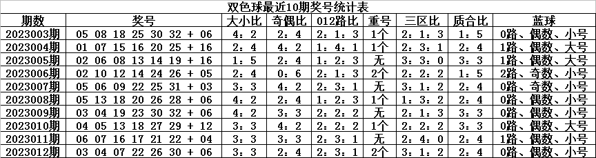 上期蓝球开出0路、偶数、小号:06,近10期蓝球012路比为6:3:1,奇偶比为2:8,大小比为3:7,本期蓝球注意号码03、06、07、08、10。