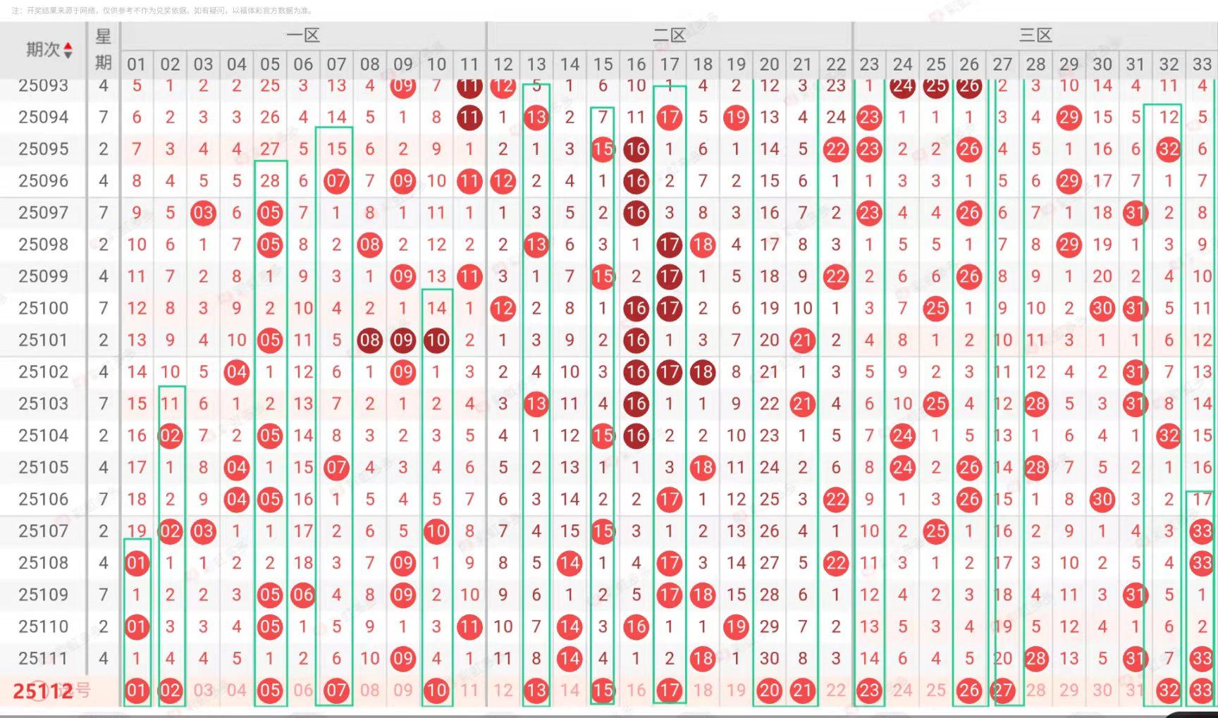 第六位33奇偶比是13:10,质合比是6:17,奇质数重合数有6个奇数、6个质数按出现顺序排列分别是29、23、31、31、29、31,而29出现2次,31出现3次。偶合数重合数有10个偶数、10个合数按出现顺序排列分别是32、28、26、32、22、20、28、32、24、28,而28、32出现3次。奇合数重合数有7个奇数、7个合数按出现顺序排列分别是33、33、33、27、33、21、33,而33出现5次。在百期内33在第六位出现的次数中在码落后出现的第六位数的跨度在20到33之间也在二区到三区间以内落号几率高,回看十期内第六位开奖号码出现在二区三区比为1:9,按照奇偶排列走势和质合排列走势综合看好偶合数防奇合数,所以第六位开奖号码可参考32、33