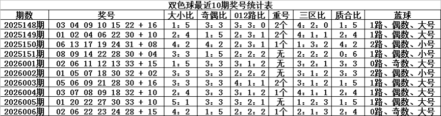 上期蓝球开出0路、奇数、大号:15,近10期蓝球012路比为2:6:2,奇偶比为2:8,大小比为7:3,本期蓝球注意号码05、06、07、09、11。