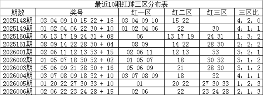 一区上期走温,出现2个奖号,近10期开出27个红球,表现非常活跃,本期预计走温,开出1-2个红球,参考号码07、10;二区上期走温,开出1个红球,近10期共开出16个红球,走势相对较冷,本期预计继续温冷,在2个以内出号,注意号码15;三区上期表现较热,出现3个奖号,近10期共开出17个红球,走势相对较冷,本期注意回补,关注3个红球,看好号码24、29、32;