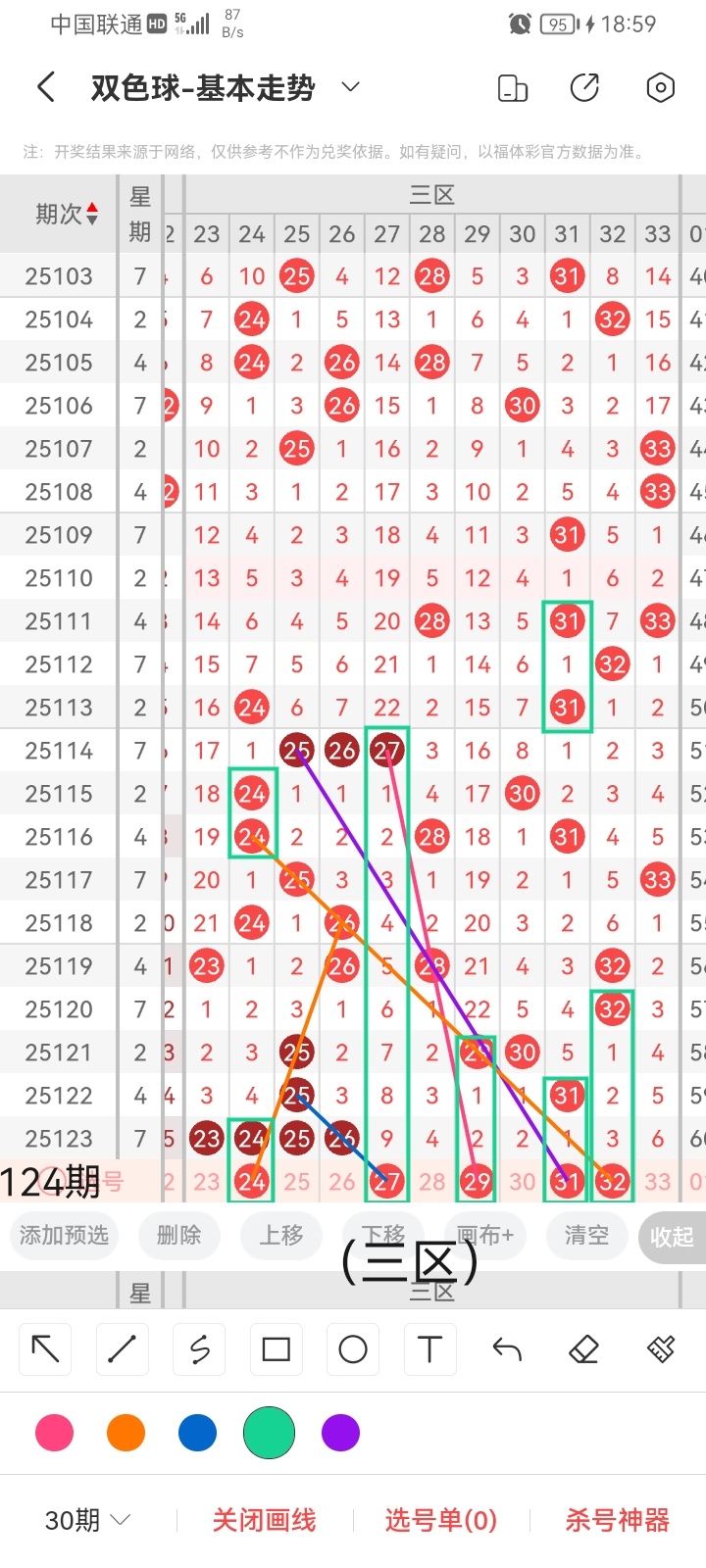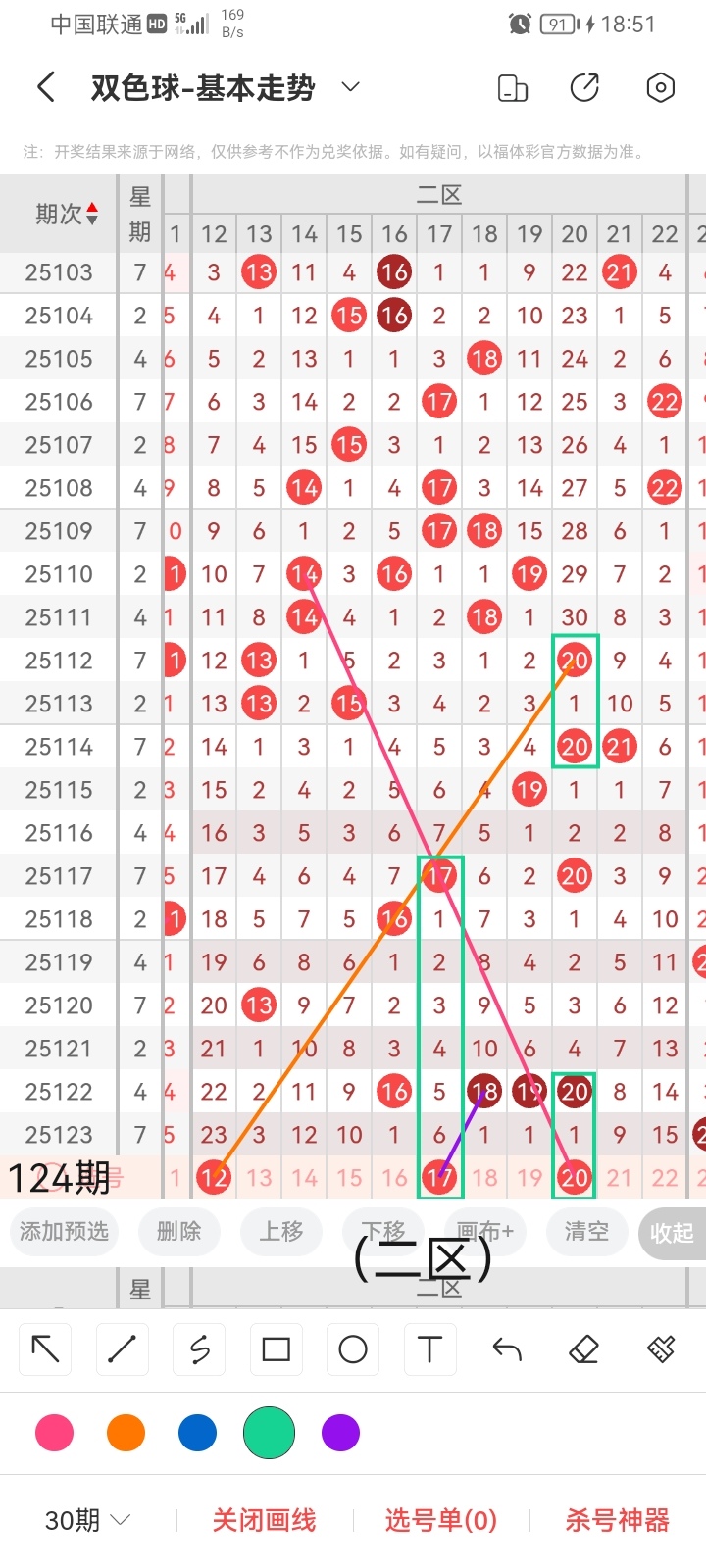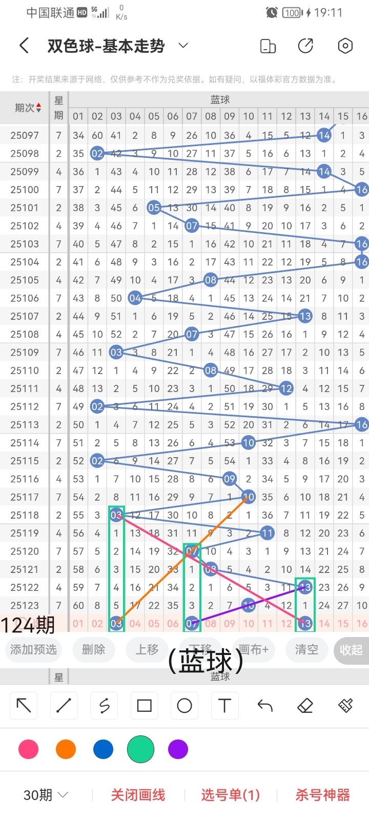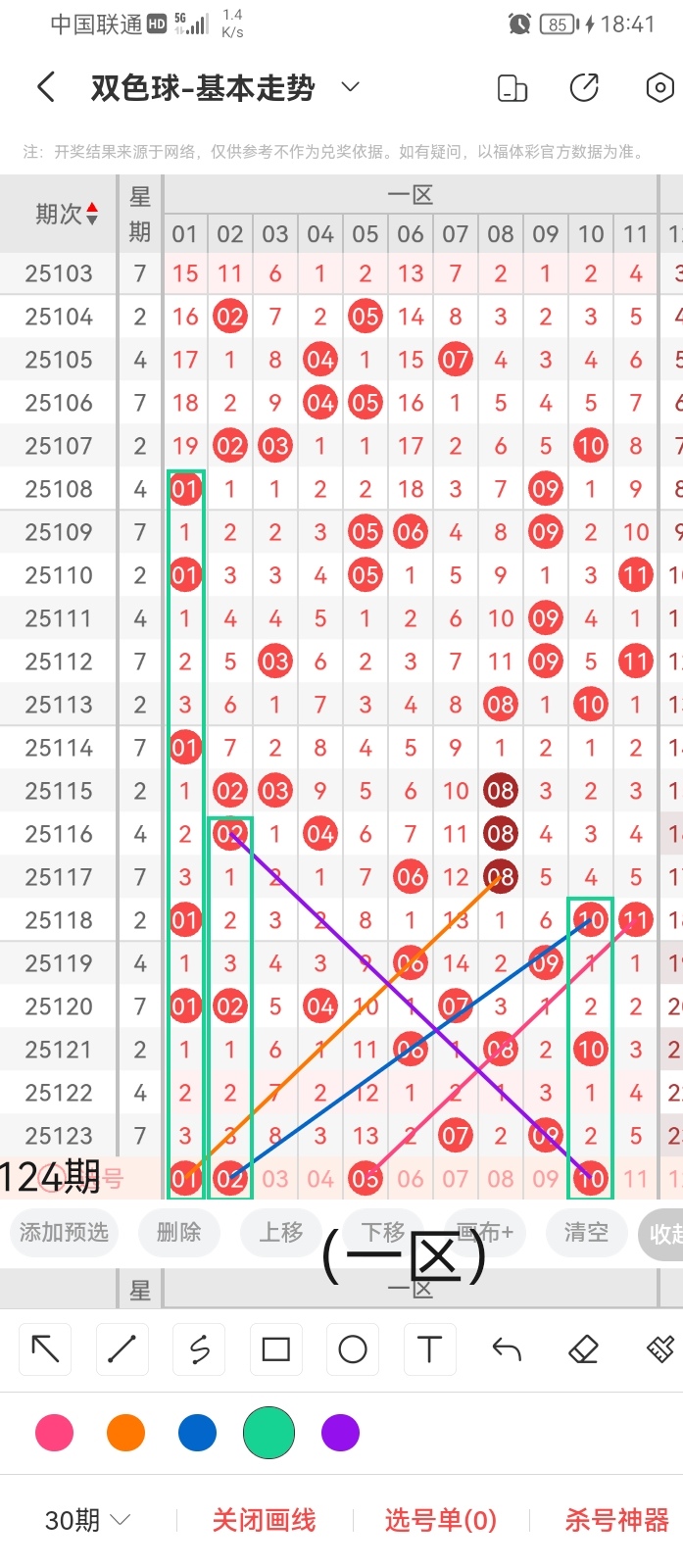 小梁根据图中画线思路,最后给大家汇总提供一下本期红球、蓝球数据,供大家参考: