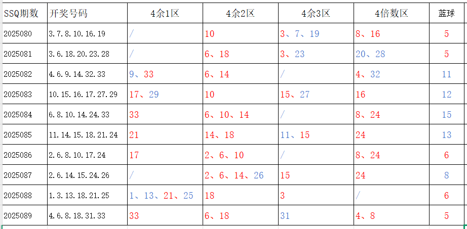 分享第一个数据分析:四分区统计数据。相对于传统的三分区,个人习惯使用四分区,就是把33个红球号码除以4,所得的余数分区如下:
