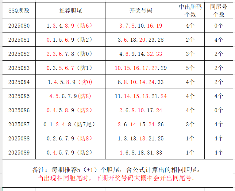 如图,每期推荐胆尾中出1-4个。上期推荐胆尾中出1尾1码!推荐胆尾是按照公式计算的顺序,不定位红球号码的顺序。本期推荐胆尾:3尾/7尾/4尾/5尾/8尾 。加推重点胆尾:***(会员专区可见)。推荐胆码号码:***(会员专区可见)。个人分析,仅供参考。