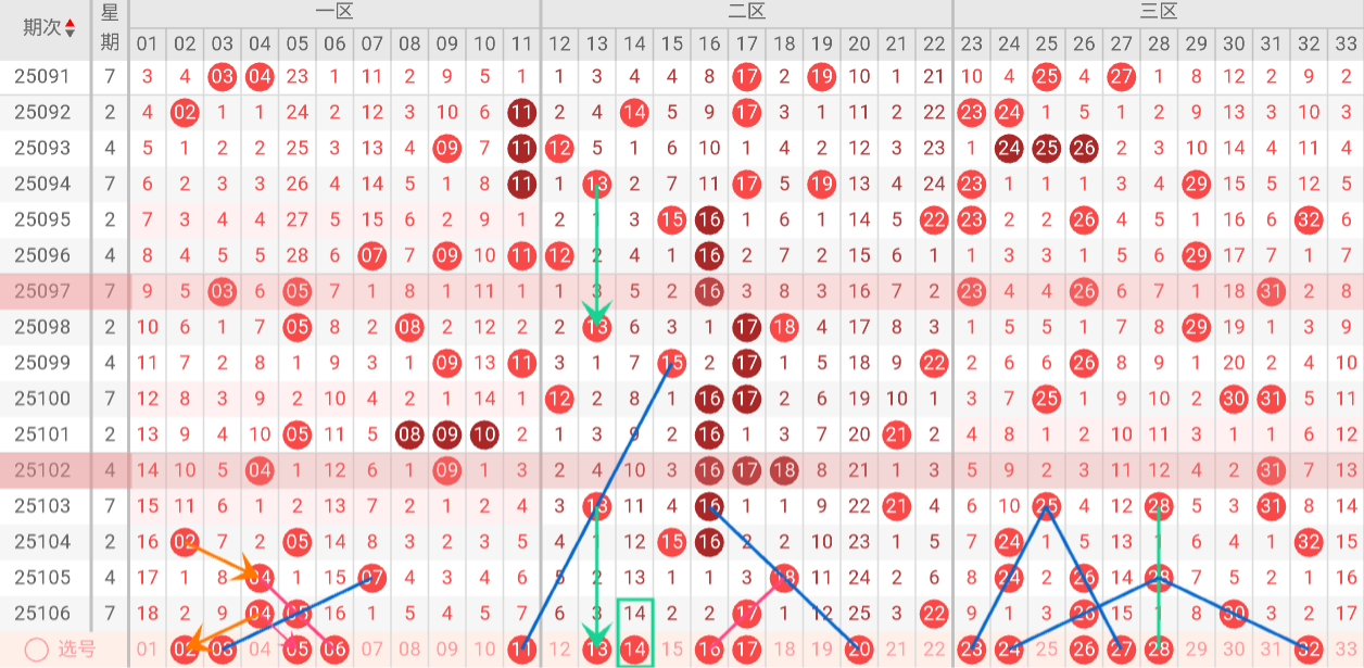 根据以上特点,我们对双色球第25107期进行如下分析:
