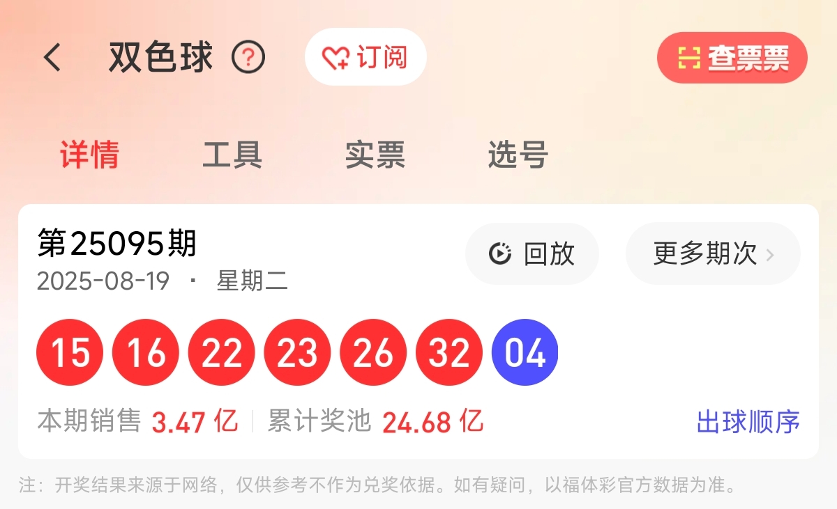 首先让我们回顾一下上期双色球25095期的开奖号码为15、16、22、23、26、32,蓝球04。和值134,跨度17,区间比为0:3:3,奇偶比为2:4。