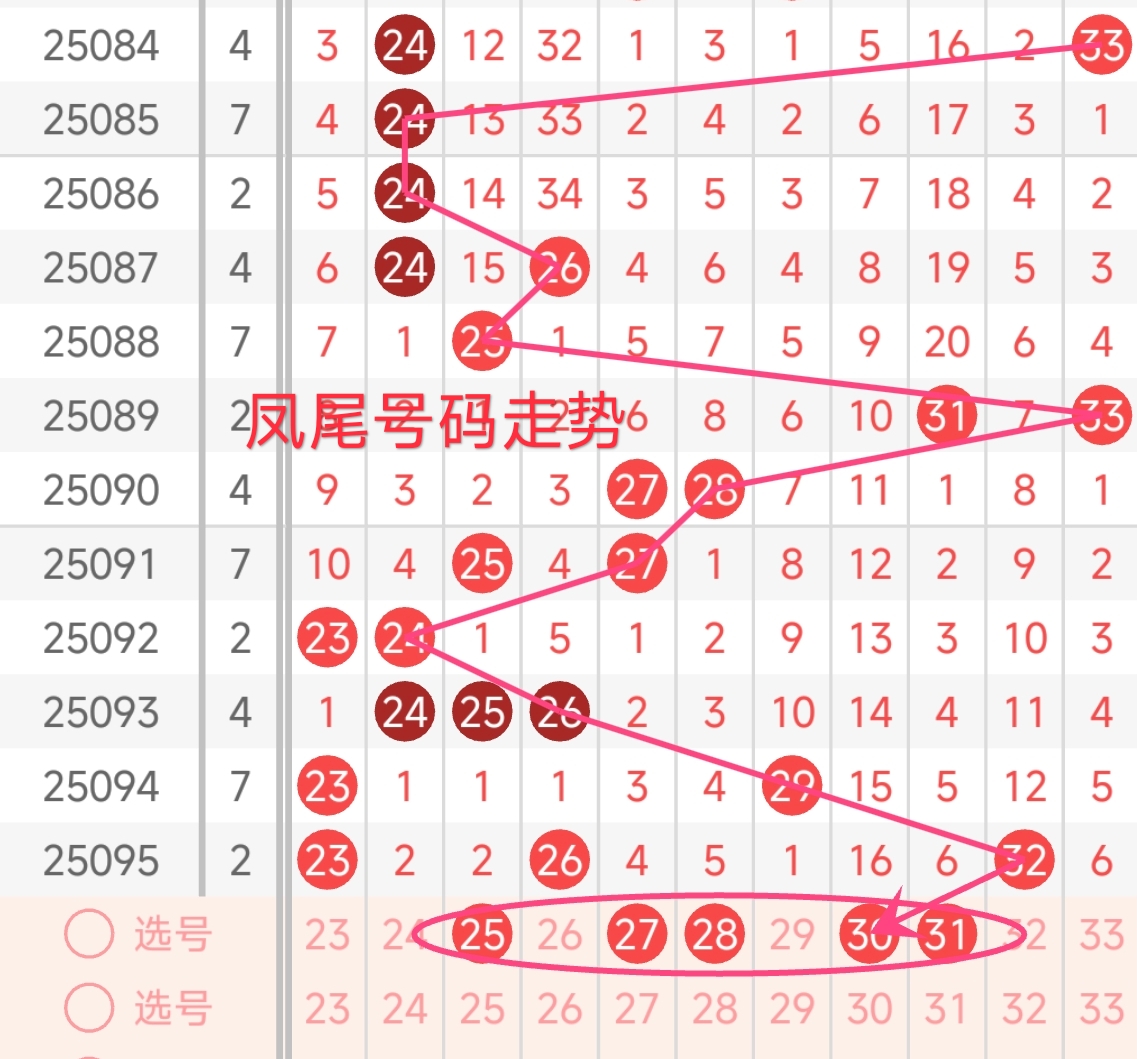 上期凤尾号码为32,振幅上升了3点,开出了偶数号码。回顾近期凤尾号码,振幅波动较大。上期凤尾为32,处于红三区的后半段。近期凤尾号码出号较大,预计本期凤尾号码可能会有所回调,关注25 - 31区间的号码。本期还需注意一些连续漏出的号码有望在本期热出。本期凤尾号码可重点关注25、27、28、30、31。