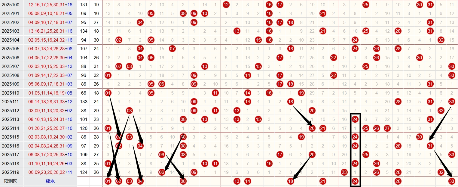 回顾上期25119期开奖06 09 23 26 28 32+ 11,其中一小区01-11出2个,二小区12-22出0个号,三小区23-33出4个!