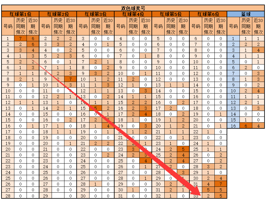 蓝球,历史同期频次最多的为16;近30频次最多的为3-10-16,明显特征是1优势;推荐重点3-7-8-10-13-16