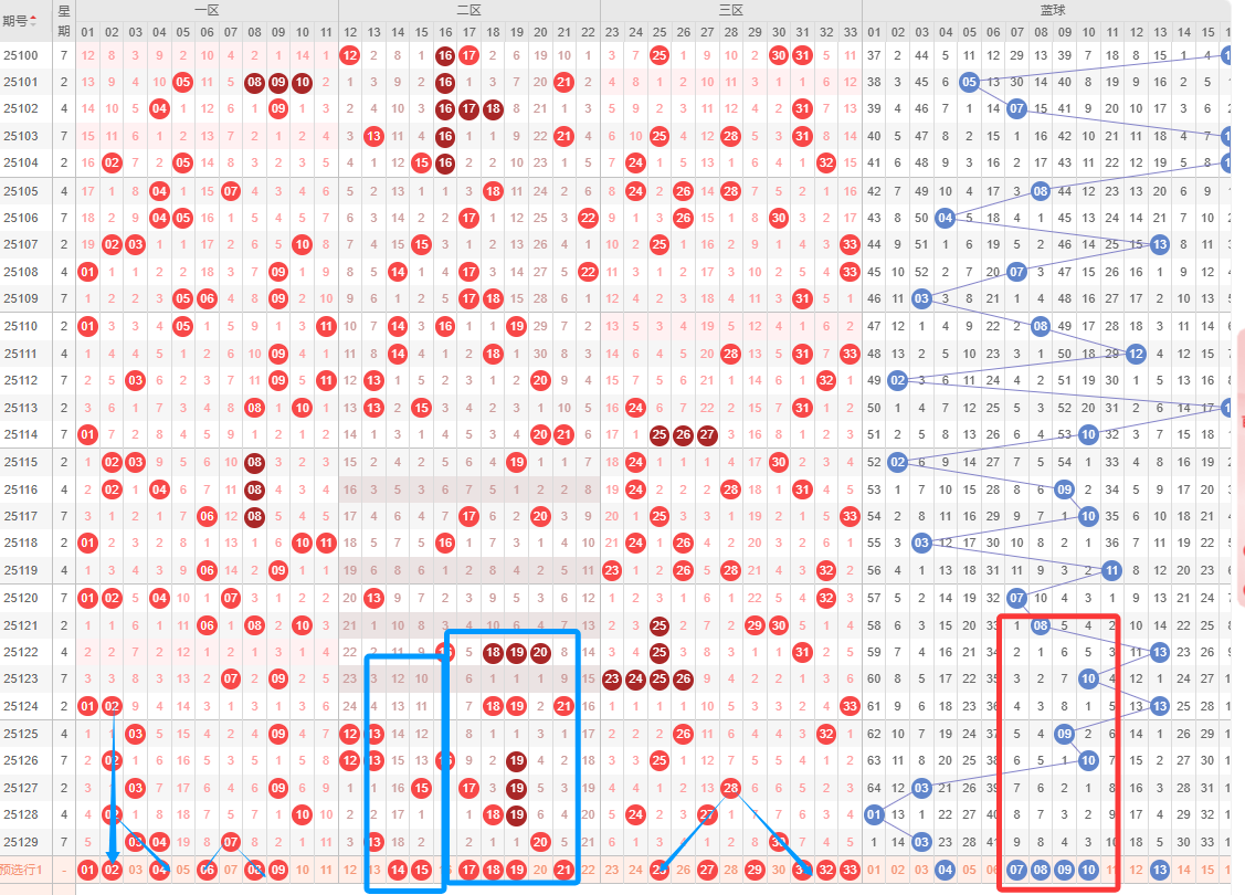 6位,基本在24-33之间,历史同期频次最多的3230期,频次最多的为31,明显特征是合数优势;推荐重点27-28-30-31-32-33