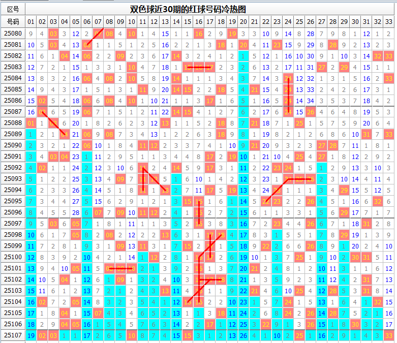 双色球108期冷热号码及出号趋势分析(具体号码可参见上图或会员文章的觅宝图):