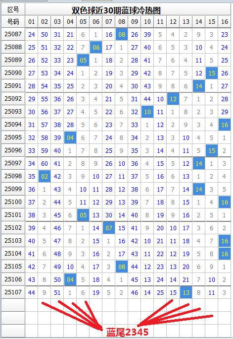 蓝球本期有热蓝8枚,冷蓝8枚,蓝球冷码数量一样。上期开出冷蓝,这是连续3期开出,由于近期蓝球冷热交替开出规律不明显,本期蓝球冷热难定。